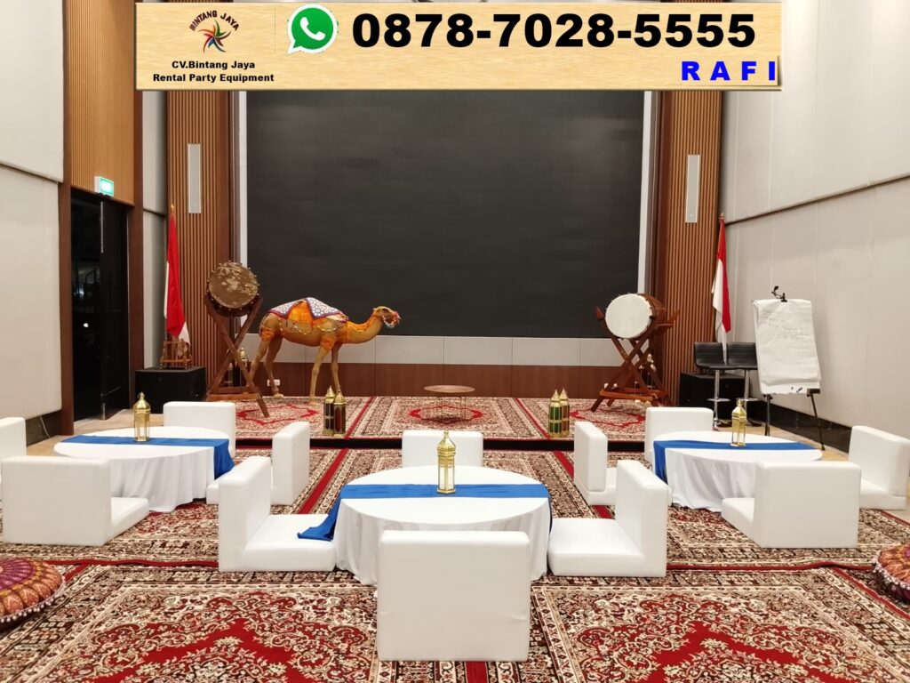 Jadi, tunggu apalagi? Segera hubungi Bintang Jaya untuk menyewa karpet permadani coklat, sofa lesehan, dan meja lesehan dengan cover biru untuk acara kamu!