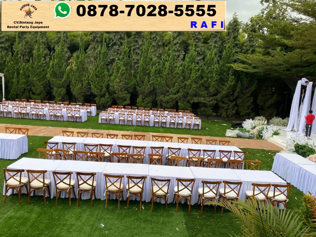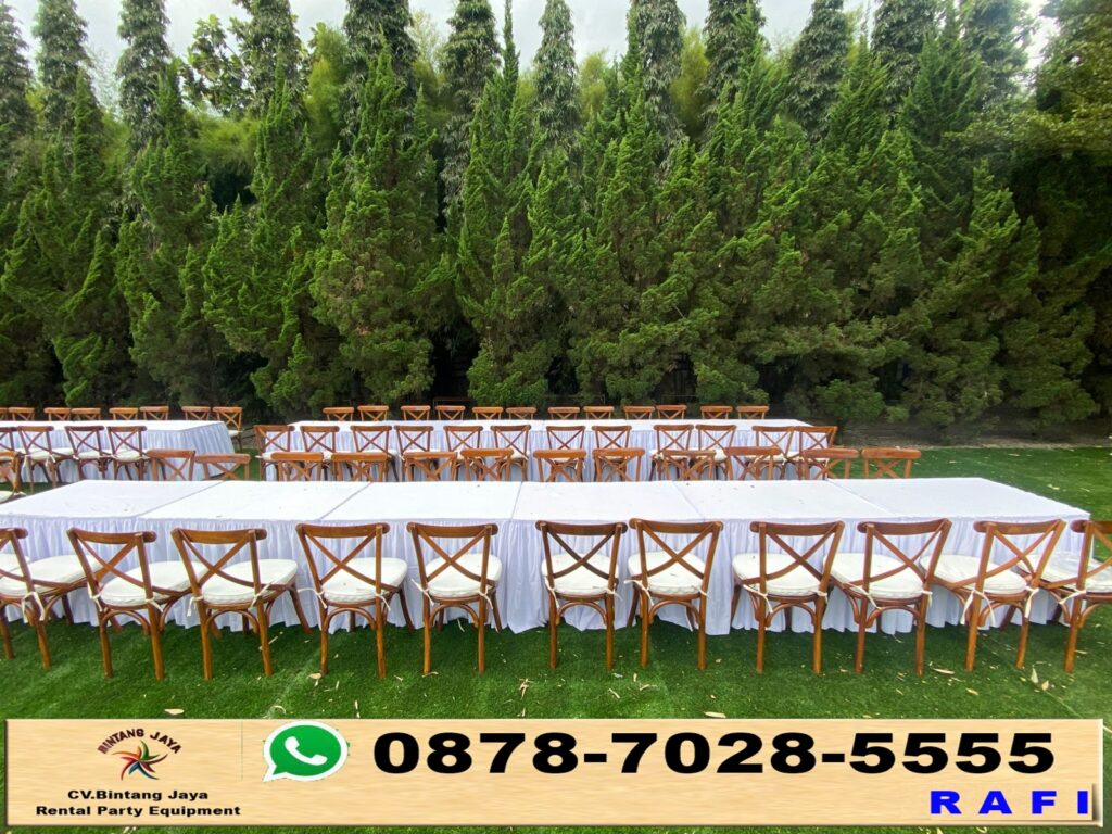 Sewa kursi crossback + meja kotak 120x80cm taplak putih di Bandung. Kalau kamu lagi nyari sewa kursi crossback dan meja kotak ukuran 120x80cm dengan taplak putih, kamu udah datang ke tempat yang tepat! Event yang sukses itu butuh persiapan yang matang, dan salah satu hal penting adalah pilihan furniture yang tepat.